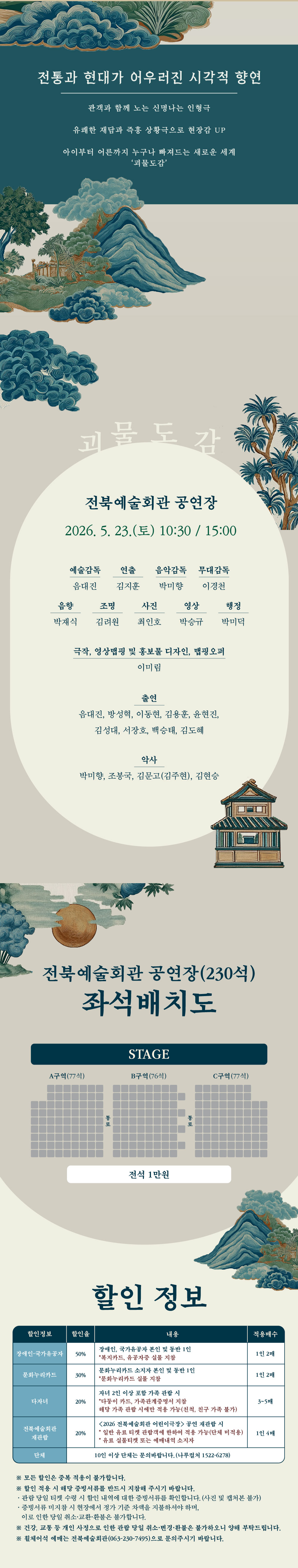 - 할인정보 : 장애인(1인 2매) 50%할인, 국가유공자(1인 2매) 50%할인, 문화누리카드(1인 2매) 30%할인, 다자녀(3~5매) 20%할인, 재관람(1인 4매) 20%